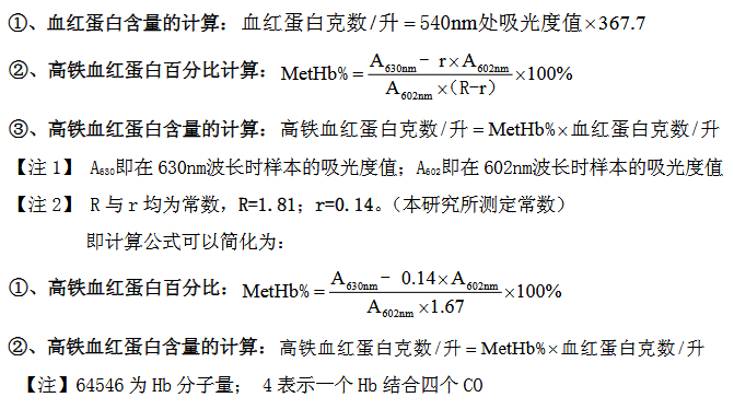 3、高铁血红蛋白测定: 取 0.05ml 全血,加入 2.5ml 的试剂二稀释应用液(即高铁血红蛋白测定应用液),混匀,静置 5 分钟后,1cm 光径,双蒸水调零,测定 630nm 处及 602nm处吸光度值。如果没有双波长的分光光度计则可以先测定各管 630nm 处吸光度值,然后再测各管 602 nm 处吸光度值。但一定要注意各管的编号不要弄错。