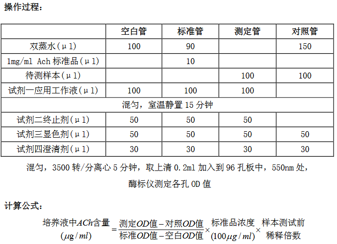 本试剂盒可测各种细胞培养液等样本中 Ach 含量;
