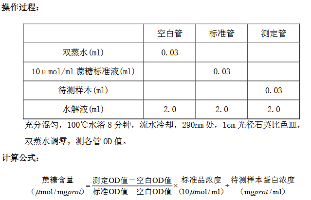 蔗糖是光合作用的主要产物,广泛分布于植物体内,特别是甜菜、甘蔗和水果中含量极高。蔗糖是植物储藏、积累和运输糖分的主要形式。实验仪器: 试管、微量移液器、旋涡混匀器、100°C水浴箱(气浴箱)、可见分光光度计(290nm)适用范围: 本试剂盒可测各种植物组织等样本中蔗糖含量;