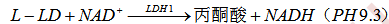 反应体系中加有硫氰酸胍抑制剂,能抑制 LDH1、LDH3、LDH4 和 LDH5 的活性,测定结果为 LDH1 活力。在波长 340nm 处测定 NADH 生成速率,计算出 LDH1 活力。