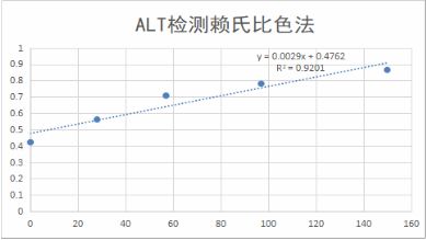 混匀,向各管中加入苯肼显色液 20ul,混匀,37℃孵育 20min,加入 ALT显色基液200ul,混匀。室温放置 5min,以蒸馏水调零,酶标仪 505nm处读取各管吸光度。各管吸光度均减去”0”号管吸光度,所得吸光度差值(纵坐标)与对应的卡门酶活力单位(横坐标)作图。