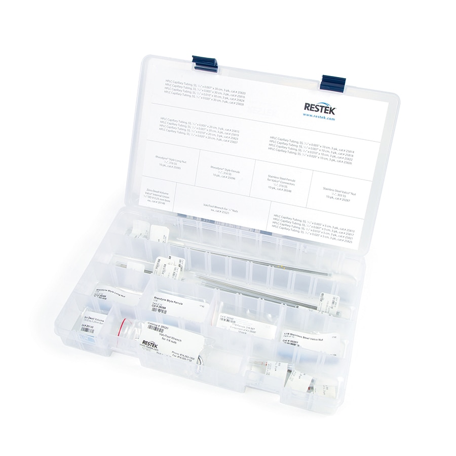 The stainless-steel survival kit contains a wide range of tubing, fittings, and tools necessary to set up and maintain your HPLC system: a selection of lengths and IDs of 1/16" tubing, nuts, ferrules, a ValvTool wrench, and a zero-dead-volume union.