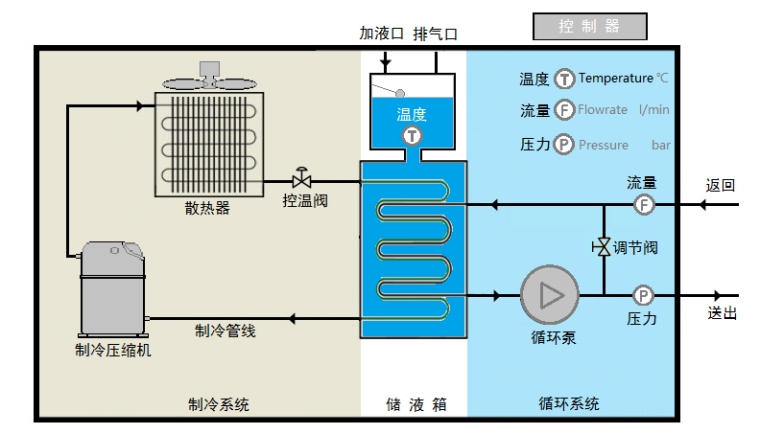 工业冷水机是先向机内水箱注入一定量的水,通过制冷系统将水冷却,再由水泵将低温冷冻水送入需冷却的设备,冷冻水将需要冷却的设备的热量带走后温度升高再密闭回流到水箱,达到冷却的作用。冷却水温可根据要求自动调节,长期使用可节约用水。因此,工业冷水机也是一种标准的节能环保设备。