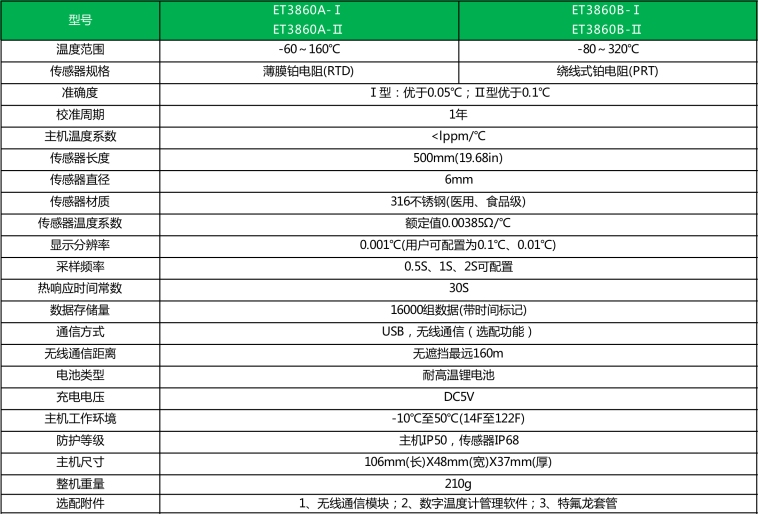 ET3860数字式标准温度计是工业温度校准、精密测量领域的新选择,其准确性和重复性可以达到优于0.05℃/年,锂电池供电(无需更换电池)续航持久,携带方便,读数直观,坚固耐用。不仅可以在实验室作为温度标准,更可以在工业现场提供可靠、准确、高精度的温度测量。