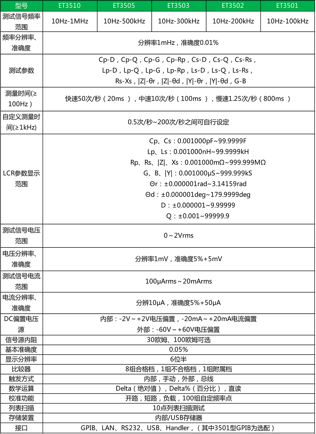ET35系列LCR数字电桥是采用自动平衡电桥原理设计的高精度元件参数分析仪,其10Hz~1MHz的测试带宽、频率连续可调、0.05%的基本测量精度以及仪器所提供的自动电平控制功能、列表扫描和档计数功能为绝大多数元器件和材料提供准确、完整的测量与分析,广泛适用于产品研发、元器件入厂检验、产品在线分检等应用场合。