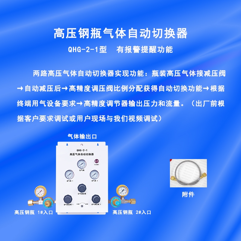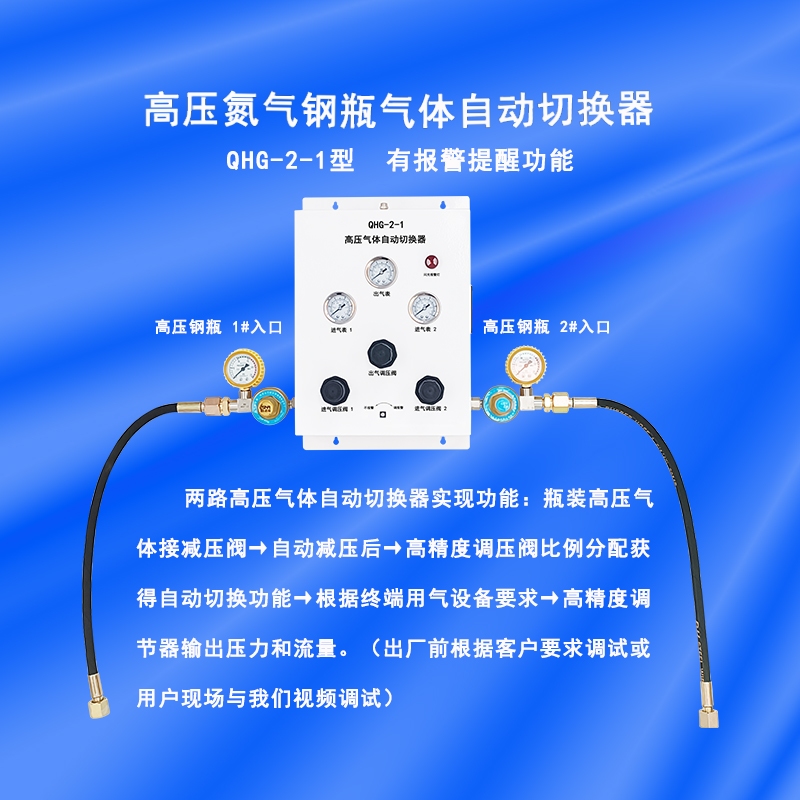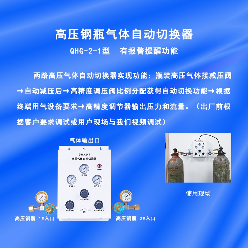高压钢瓶气体自动切换器广泛用于:氮气、空气、氢气、氩气、氧气、二氧化碳、一氧化碳等各种非腐蚀性气体。使用设备:气相色谱仪、氮吹仪(吹扫仪)、液质联用仪、手套箱、光谱仪、防氧化柜、反应釜、激光切割、3D打印等设备