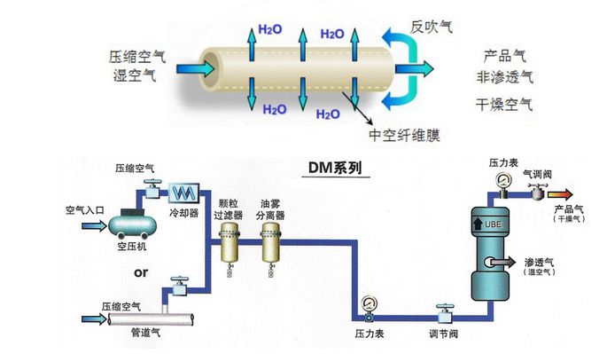 当水蒸气通过中空纤维膜时,水分子的渗透速率较快,在压力差的作用下,水蒸气(H2O)渗透到渗透侧,其他气体空气中其他气体分子如O2、N2、CO2、He则留在渗余侧,并在压力的推动下到达出气口,从而达到脱湿、干燥的目的。