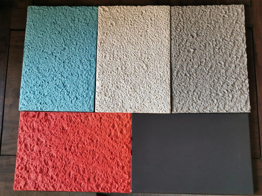 颜 色:色泽丰富,请阅读色卡。由于防火乳液和吸音纤维特有的性能,调颜色方面只能5到6成接近色卡,无法像普通涂料乳胶漆调色那么标准。如果某些工程对颜色要求一致性非常严格,先喷吸音涂料,24小时后,在表面再喷涂二层同颜色的吸音乳胶漆,这样一般都可以达到颜色一致要求,但是会少量影响吸音效果,所以一般建议不要再喷面漆罩色;(提示:由于表面凹凸不平,不同角度,不同光线看,颜色会略有差别);如果需要接近相对平面效果,请用平嘴枪嘴,直着喷,不要倾斜,喷涂之后,根据需求,可以用刮涂工具,刮平一下,需要技巧。如果需要凹凸感比较强,一般倾斜45度角来喷涂,调整风力,灵活掌握,根据现场情况。