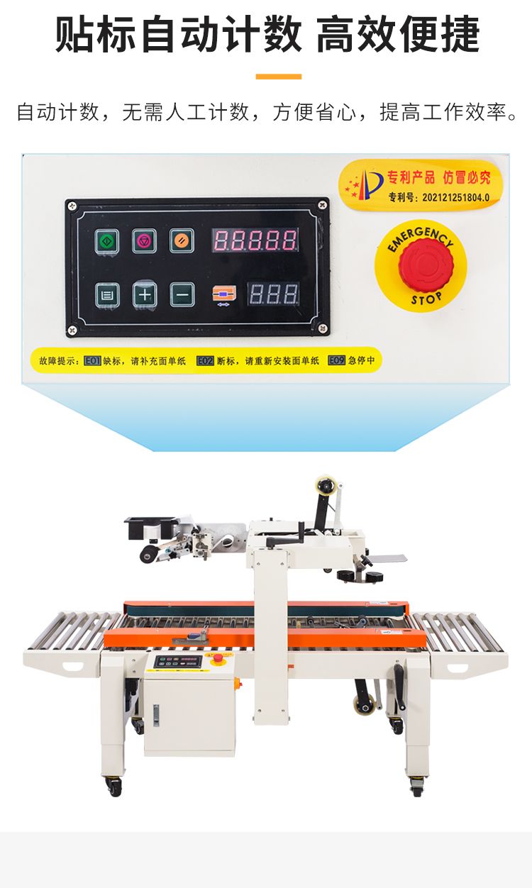 本机荣获多项专利(发明专利号:202110628644.5 .实用专利号:202121251804.0)1封箱贴快递面单一次性完成,效率高。2体积小、占地小、移动方便。3超高性价比,电商爆款发货必备。最大封箱尺寸:W500×H500mm,最小封箱尺寸:W80×H90mm;封箱胶带宽度:30mm 45mm;面单规格:通用折叠面单纸,宽度20-100mm。