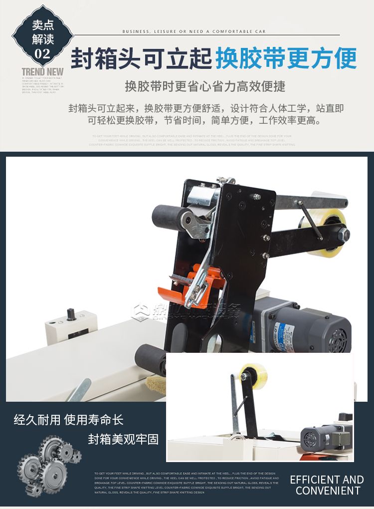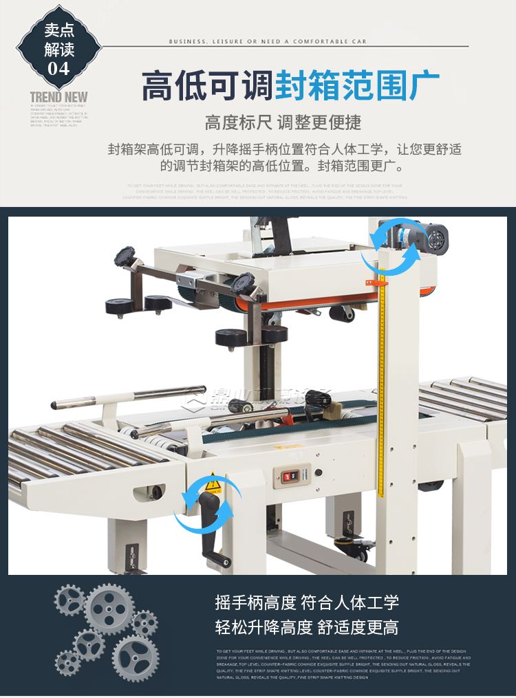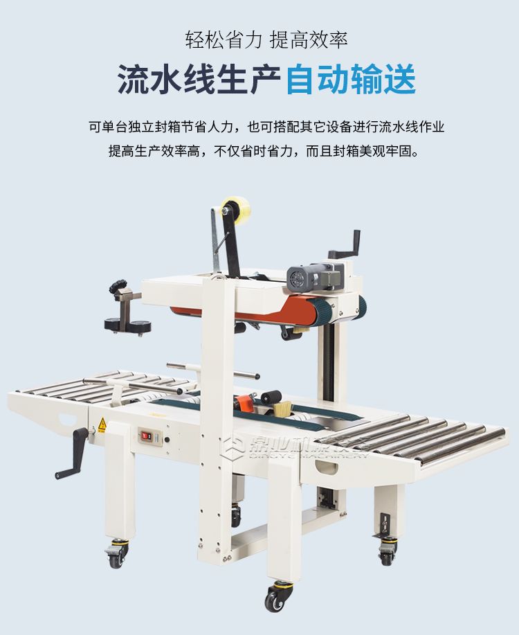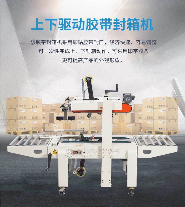 封箱机采用即贴胶带封纸箱封口,经济快速、容易调整,可一次完成上、下封箱动作,也可以采用印字胶带,更可提高产品形象。封箱机的关键部件是驱动电机。电机功率越大越好。轻巧耐用,操作简单。胶带封箱机主要适用于纸箱的封箱包装,即可单机作业成绩,也可与流水线配套使用,广泛应用在家用电器、纺织、制药、烟草、食品、百货、医药、化工等行业。
