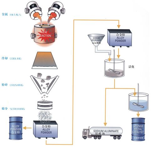 镍铝合金粉为银灰色无定型粉末,具有中等程度的可燃性,有水存在的情况下部分活化并产生氢气易结块,长久暴露于空气中易风化。