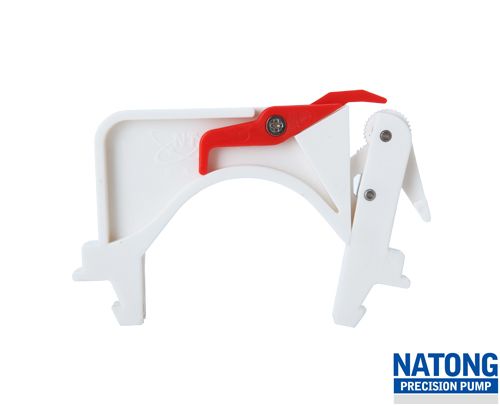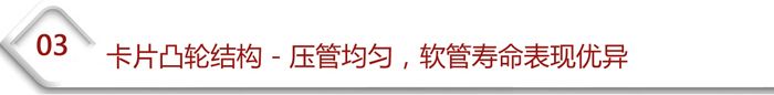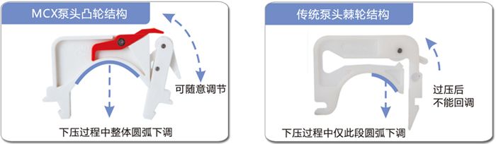 | 传统泵头采用荆棘轮调节压管间隙,过压后不能回调,必须松开卡片重新调节,调节过程中,圆弧不是整体移动,而是部分圆弧与滚乱间隙变小,造成整个圆弧范围内压管间隙不均匀,局部地方会过压,软管寿命短;而MCX泵头采用凸轮结构,可以前后任意调节,调节过程中,圆弧整体向滚轮靠拢或者分离,压管间隙均匀,保压能力强,软管寿命长。另外,纳通卡片采用进口POM原料,含有铁氟龙成分,更加耐磨,泵头寿命更长。