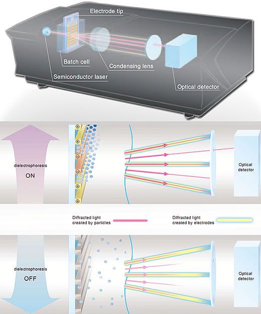 该仪器采用诱导光栅(IG)方法,这种全新的方法基于利用双向电泳和衍射光现象测量来实现纳米范围粒度的测定。