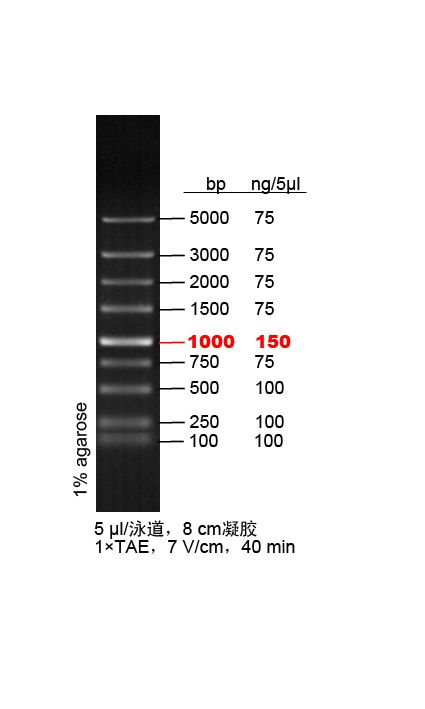 DSTM 5000由9条双链线状DNA片段混合而成,指示带为1,000 bp,便于电泳后观察。