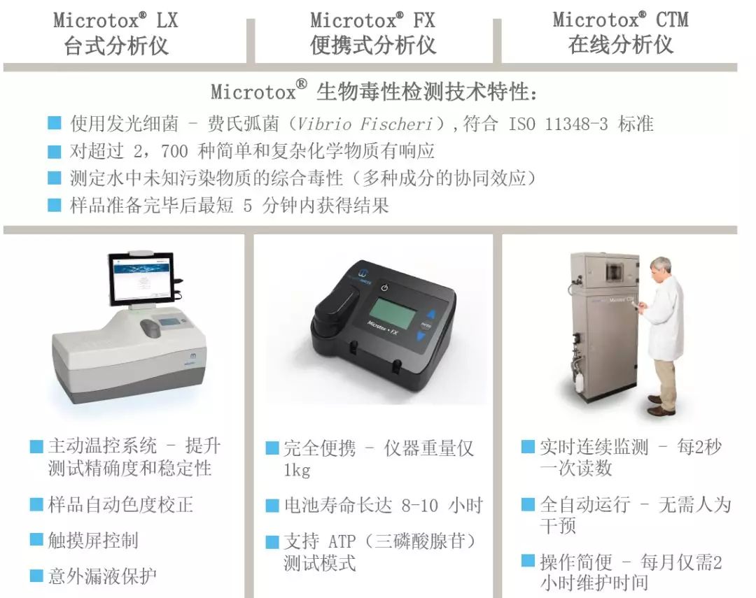 - Microtox®LX/Microtox® M500 台式毒性仪,适用于实验室;