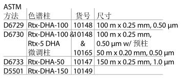 汽油是数百种化合物组成的复杂混合物。有关各个组分的浓度是评估原料及控制炼油过程的重要信息。ASTM D6730-01概括了汽油中详细烃类分析(DHA)的高分辨率气相色谱法。RTX®-DHA是DHA方法的理想色谱柱,轻松地达到或超过ASTM D6730-01和加拿大通用标准委员会CAN/CGSB 3.0 No.14.3-99的要求。每一根Rtx®-DHA色谱柱对保留时间,效率,固定相选择性,和柱流失进行测试—保证柱与柱之间的重现性。