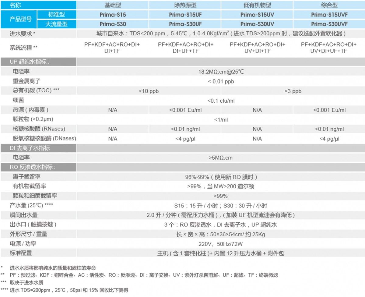 现有 Prima-Q/S 2 个子产品系列,可产出RO 反渗透水、DI 去离子水 / 高纯水、UP超纯水,产量:15 升、30 升 / 小时.