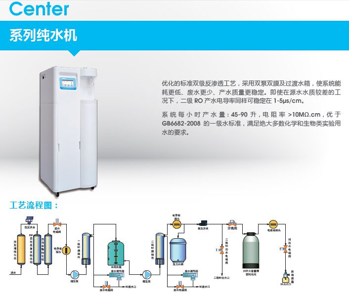 新Center系列纯水机双极反渗透工艺,双泵双膜及过渡水箱,系统能耗更低、废水更少、产水质量更稳定...