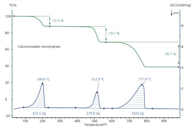 下图显示了室温至 1000℃ 温度范围内,CaC2O4-H2O 的 TGA 与 DSC 曲线。第×阶段失重台阶为脱水过程,样品脱水之后转变为无水草酸钙(CaC2O4)。第二阶段失重台阶是由 CO 的释放所致,代表了从草酸钙向碳酸钙(CaCO3)的转变。在 700℃ 以上,碳酸钙分解,释放 CO2 ;残余质量为氧化钙(CaO)。实验测量到的失重量与理论值非常吻合(偏差 < 1%)。这证明了 STA 449 F5 Jupiter® 热天平拥有很高的测量准确性。