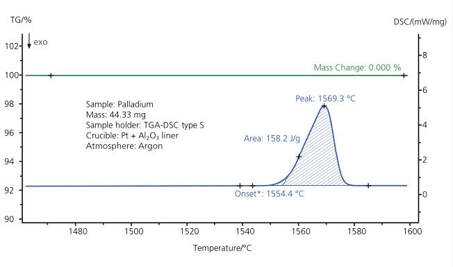 钯(Pd)在今天的最大的用途是作为催化转换器。此外,它也常被用于牙科、飞机火花塞、手术器械、电接触材料等其他领域。钯在室温下与氧无反应,但当在空气气氛下加热至 800°C 时,将生成一层非常薄的钯(II)氧化物(PdO)。此图显示了在 STA 上进行的 Pd 的测量,最高温度 1600°C。蓝色的 DSC 曲线显示了熔融过程,热焓 158 J/g,熔融起始点 1554°C。这两个值均与纯 Pd 的理论值非常接近,偏差 < 1%。绿色的 TG 曲线显示,在熔融前后未发生失重;这证明了金属的高纯度,以及系统的真空密闭性。
