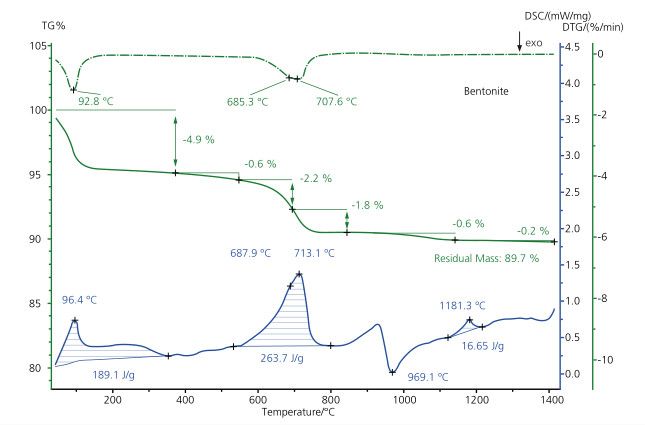 斑脱岩是一种粘土,主要由胶岭石所组成,由于其吸附能力而为人称道。该矿物材料常被应用于粘合剂,净化器等领域。本图中绿色曲线为 TG,绿色点状线为 DTG,蓝色曲线为 DSC 曲线。第×失重步骤(DSC 峰值温度 96℃)由水的释放所引起,随后有一 0.6% 的小的失重过程,很可能由有机杂质裂解所引起,表明材料中含有少量黄铁矿杂质。在 600℃ 以上,水从斑脱岩结构中释放出来(DTG 峰温 685℃ 与 708℃)。DSC 曲线在 969℃ 的放热峰代表了该矿物的相转变。1181℃ 的吸热峰最可能的原因是部分熔融。