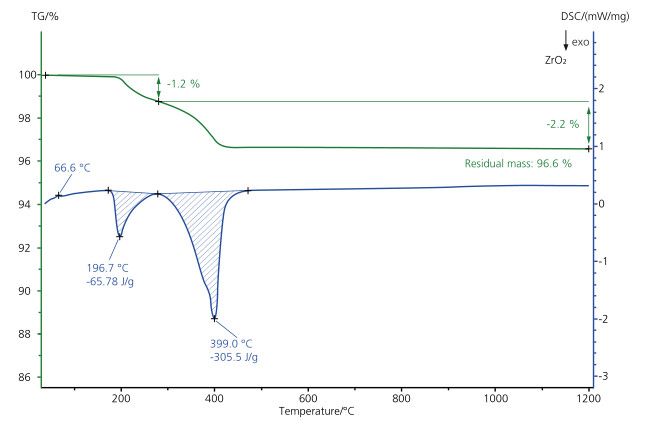 下图的测量温度范围为室温至 1200℃,绿色曲线为 TG 曲线,在 450℃ 之前有两个小的失重过程,总失重量 3.4%,与蓝色 DSC 曲线上的 197℃、399℃ 两个放热峰很吻合。这些效应是由于陶瓷材料中粘合剂的烧出所致,热值较高,峰形较大。67℃ 附近的小的 DSC 吸热峰则由粘合剂的熔融所致。