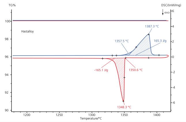 Hastelloy 是一种镍-铬-钼-钨合金,拥有出色的高温稳定性,即使在高温下仍具有良好的延展与耐腐蚀等性能。它常被应用于可燃气体脱硫、化学工业、烧灼去菌等。图中升温 DSC(蓝色)曲线中可见 Hastelloy 样品(合金22)的熔融发生在 1358℃(外推起始点),热焓 165J/g。降温 DSC(红色)曲线可见结晶过程发生在 1351℃(外推起始点),其焓变与熔融过程几乎完全相等。升降温的 TG 曲线均为水平线,未观察到失重、或由氧化所导致的增重过程。