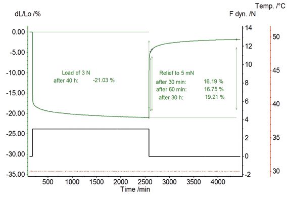 对于密封材料而言,能够在经过持续的作用力后恢复至原始状态是至关重要的。为了测量这一性质,我们施加 3N 的作用力于某种弹性密封材料上,随后减少为 5mN 持续 40 小时,可以观察到压缩量为 21%,撤去作用力,30min 后压缩量恢复了 16.2%,60min 后恢复了 16.8%。在长达 30 小时之后,材料并没有恢复到原始状态,仍有残余形变,这是由该材料的粘弹特性所致。