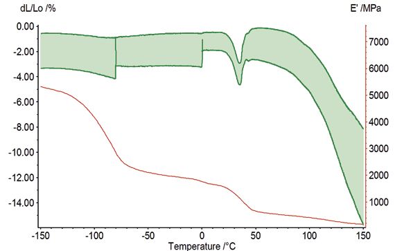 将三点弯曲模式与振荡力相结合,既定材料的粘弹性就可以得以表征。在 -150°C 到 150°C 之间,对四氟乙烯棒施加矩形的调制力(由 0.2N 的静态力和三种不同的动态力分别复合而成)。根据样品的结构特性和膨胀系数,可计算得到其储存模量 E 和温度的对应关系,同时可观察到聚四氟乙烯的三种典型变化:即 -100°C 的 β 转变,0°C 到 50°C 的晶型转变以及 100°C 的玻璃化转变。