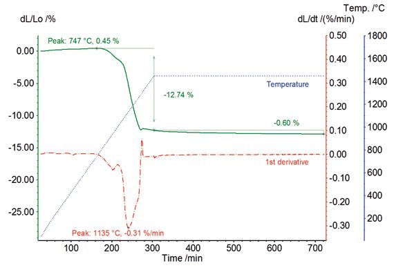 在汽车工业中,钛酸铝是作为催化转换器的载体材料。下图为钛酸铝坯体在室温到 1450°C 间的测试,测试的最后将钛酸铝在 1450°C 时恒温 7 小时。结果显示,在加热过程中,样品收缩量为 12.7%;烧结过程分为两步,较大的一次烧结速率为 0.13%/min;而在恒温段,样品又进一步地收缩了 0.6%。耐驰还提供速率控制烧结软件(RCS 选件),可进一步优化烧结工艺。