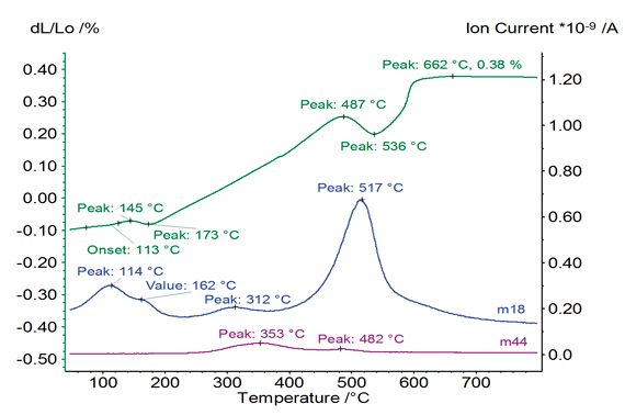 对于粘土和粉末样品,通常使用的测试方法是TMA-MS(Aëolos®)联用,温度范围是室温至800°C。样品最先释放出吸附结合水和层间水(收缩0.01%);在300°C,有机组分开始燃烧(在 m18(H2O)与 m44(CO2)的曲线上出现峰),但是由于含量较少,对膨胀曲线并无明显影响;在487°C到536°C间,粘土中的矿物成分脱水,图谱中所对应的收缩为0.05%。