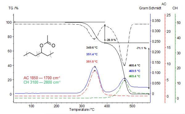 在下图中显示了 TGA 曲线(黑色),DTGA 曲线(黑色点划线)和 Gram-Schmidt 谱图(蓝色)。另外两个的提出曲线(吸收强度随温度变化曲线;红线和绿线)和DTGA曲线有很好的相关性。在 350°C 的第×个失重步骤是由于乙烯的挥发(红色曲线)。在第二个失重步骤中,乙烯已经完全挥发。绿色的曲线表示了由于聚合物主链分解而释放出的碳氢化合物的吸收强度变化过程(DTGA 峰值为468°C)