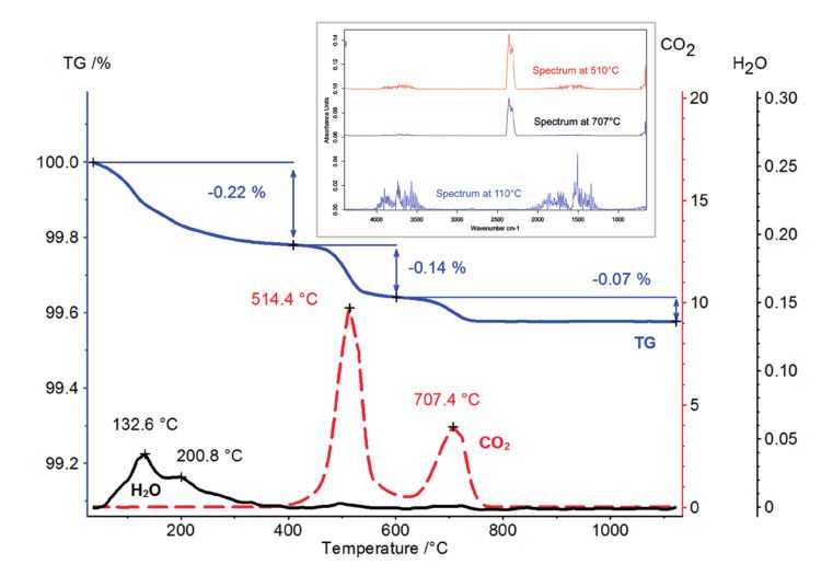 热重曲线显示了多个失重步骤。在 400°C 以前,几个失重步骤均有较小的重叠,接下来的两个失重台阶分离的很好,其 DTG 峰值温度分别为 510°C 与 705°C。样品至1100°C的总失重量为 0.43%。红外谱图显示水和二氧化碳为主要的气体产物。