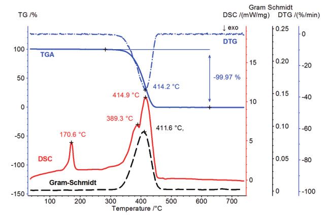 下图中,聚合物在 300℃ 和 460℃ 间有一个失重台阶。最大分解速率在414℃(DTG曲线上的峰值温度)。DSC曲线上,峰值温度为171℃的峰为聚甲醛的熔融,与文献值相符。另外两个峰值温度为389℃和414℃的峰分别对应于聚甲醛的分解反应。实验可见,DTG、DSC和红外 Gram-Schmidt 曲线上的温度对应很好。