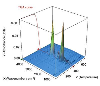 三维的红外谱图包含了温度坐标(Z 轴)与 TGA 曲线,为样品的热裂解分析提供了另一个有力的证据。