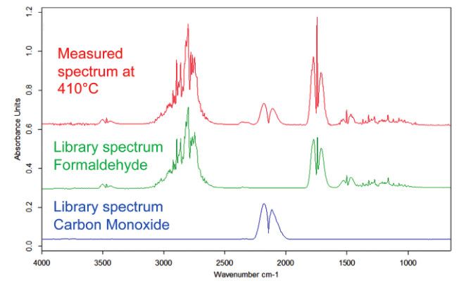 为确定逸出气体的成分,从三维谱图中提取出 410℃ 下的二维谱图(红色),与红外数据库中的标准谱图进行比对,比对结果表明气体成分为甲醛(绿色标准谱图)和 CO(蓝色标准谱图)。