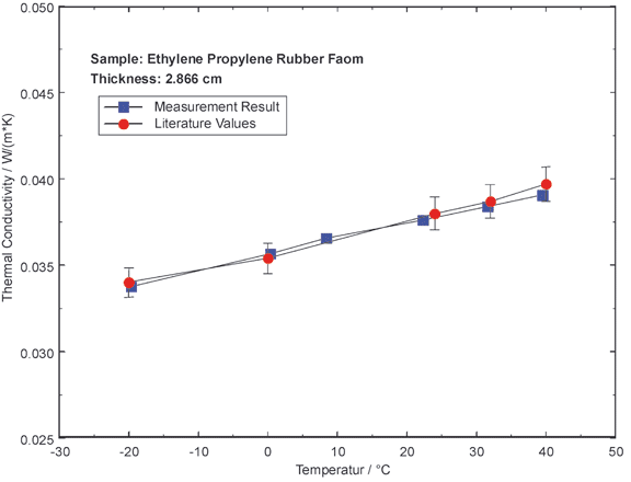 图中所示为乙丙橡胶泡沫的测量结果,使用 HFM 436/3/1 E 进行测量。同时显示的是由客户提供的该材料的理论值。可以明显地看到测量结果与相关文献值之间的偏差在 2.5% 以内。此外,可以看到连接外部冷却器的 HFM 436/3 能够在 -20°C 的低温下进行测试。
