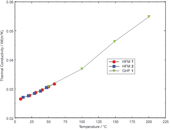 为了验证热流法与其他标准导热测试方法(如作为绝对法的保护热板法 GHP)的测量结果的可比性,进行了一系列的测试,图中显示了对其中一种微孔绝热板使用不同的 NETZSCH 热流法导热仪以及保护热板法导热仪的测量结果比较。由不同仪器获得的数据在各对应温度内偏差均小于 2.5%。这清楚地证明了 HFM 436 系列仪器的优异性能。