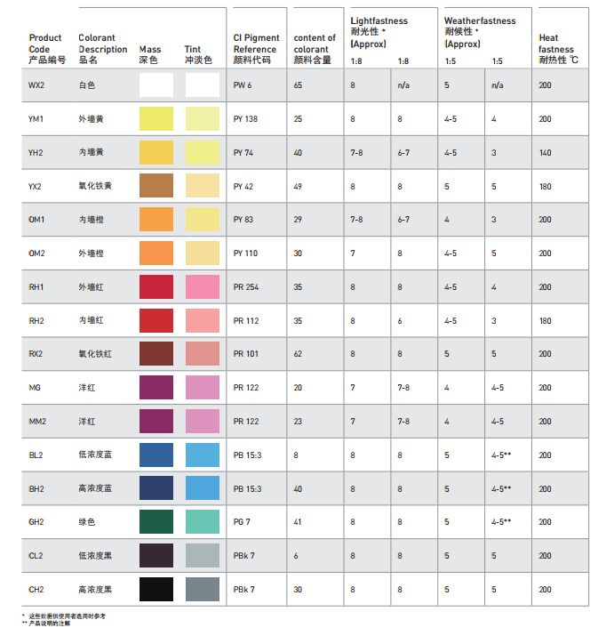 色浆体系广泛适用于各种装饰用水性内墙和外墙涂料,专门 用于水性装饰漆。 该色浆体系不含 APE,VOC 含量小于 50g 每升,与各种水性 涂料具有良好的相容性。它们既可以手工调色也可以使用机 器自动调色,对于店头调色均使用。 该色浆体系都具有非常高的颜料浓度,这样可以减少调色时 的色浆使用量,因此所有颜色都可以使用较低的成本调出来。有专门的低浓度色浆可以用来调小包装的浅色配方。