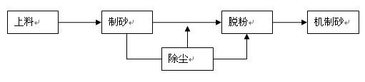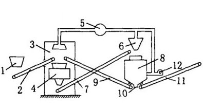 1-上料斗;2-上料皮带;3-准封闭式制砂间;4-制砂机;5-引风机;6-旋风除尘器;7-传送带;8-离心式选粉机;9-返回皮带;10-矿粉装袋器;11-出料皮带;12-吹风机