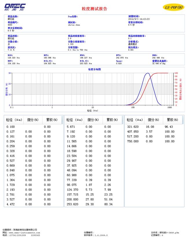10.输出数据:粒度分布表、粒度分布曲线、平均粒径、中位径、比表面积等