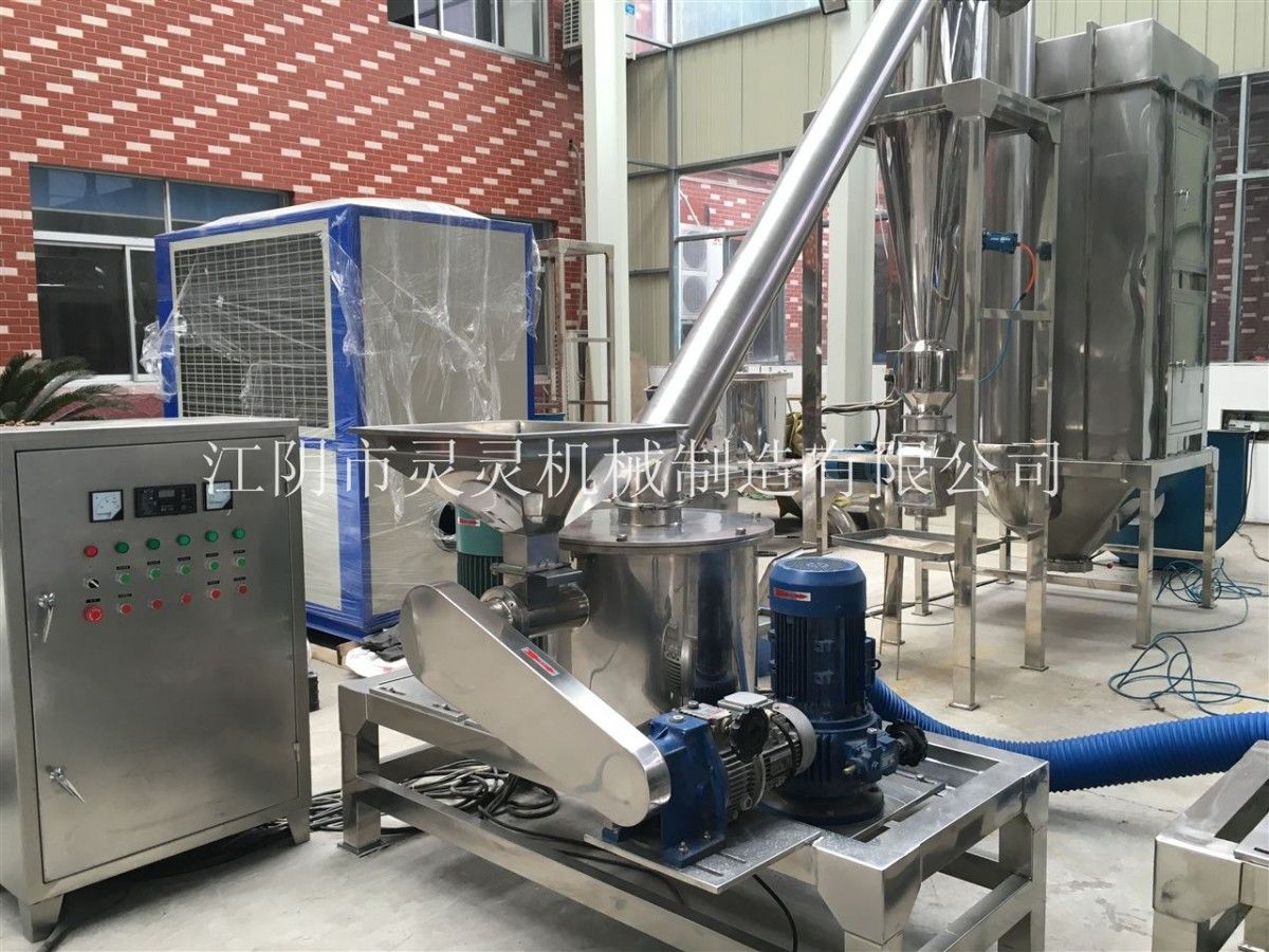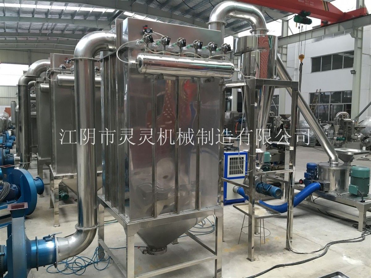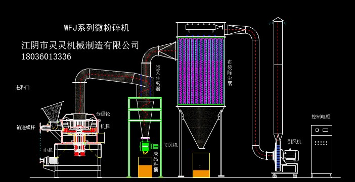 物料由料门经螺旋输送器进入粉碎室,被高速旋转的刀片剪切粉碎,通过负压风运的方法把物料运入旋风分离器,袋式除尘器、排出物料粉尘由吸尘箱经布袋过滤回收,生产过程中无粉尘飞扬,且能提高物料的利用率,降低企业成本。