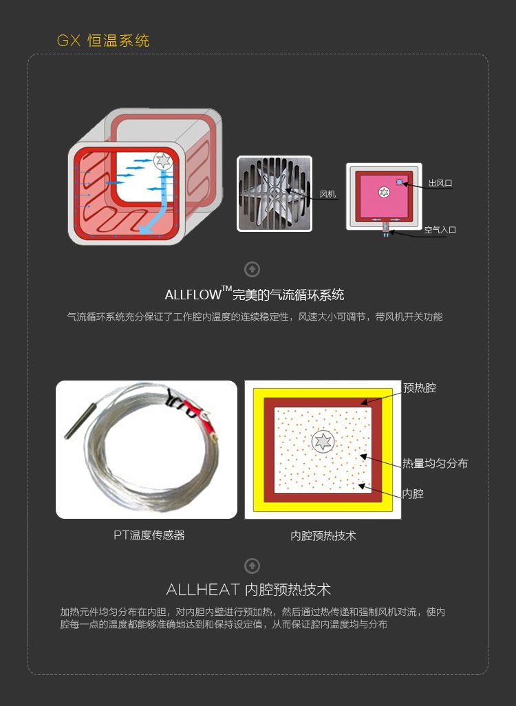 ALLHEATTM先进的内腔预热技术是将加热元件均匀地分布在内胆四周,对内腔内壁进行预加热,然后通过热传递和强制风机对流,使腔内每一点的温度都能准确地达到和保持在设定值,从而保证腔内温度均匀分布;