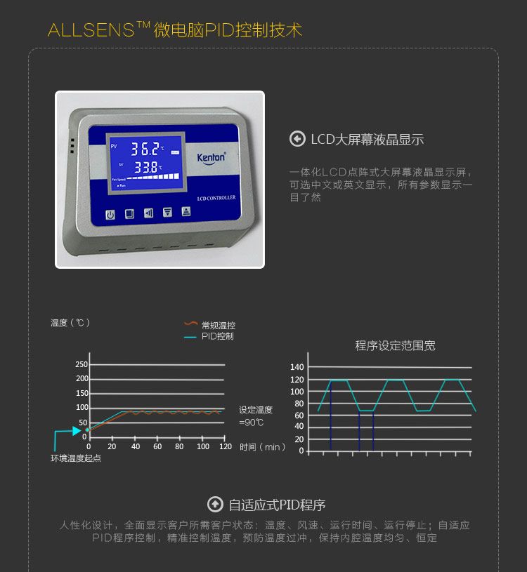 自适应式PID程度控制,精确控制温度,预防温度过冲,保持腔内温度均匀、恒定。