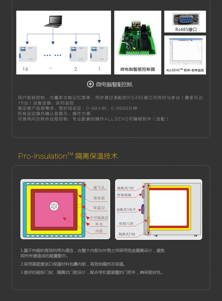 内腔预热技术:ALLHEATTM先进的内腔预热技术是将加热元件均匀地分布在内胆四周,对内腔内壁进行预加热,然后通过热传递和强制风机对流,使腔内每一点的温度都能准确地达到和保持在设定值,从而保证腔内温度均匀分布;