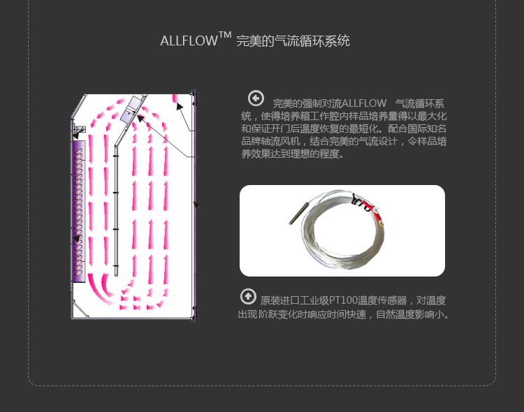 ALLFLOWTM气流循环系统:强制对流ALLFLOWTM气流循环系统,保证开门后温度恢复的最短化。配合国际知名品牌带散热风机(免维护,耐用度高),令实验和培养效果达到理想的程度。