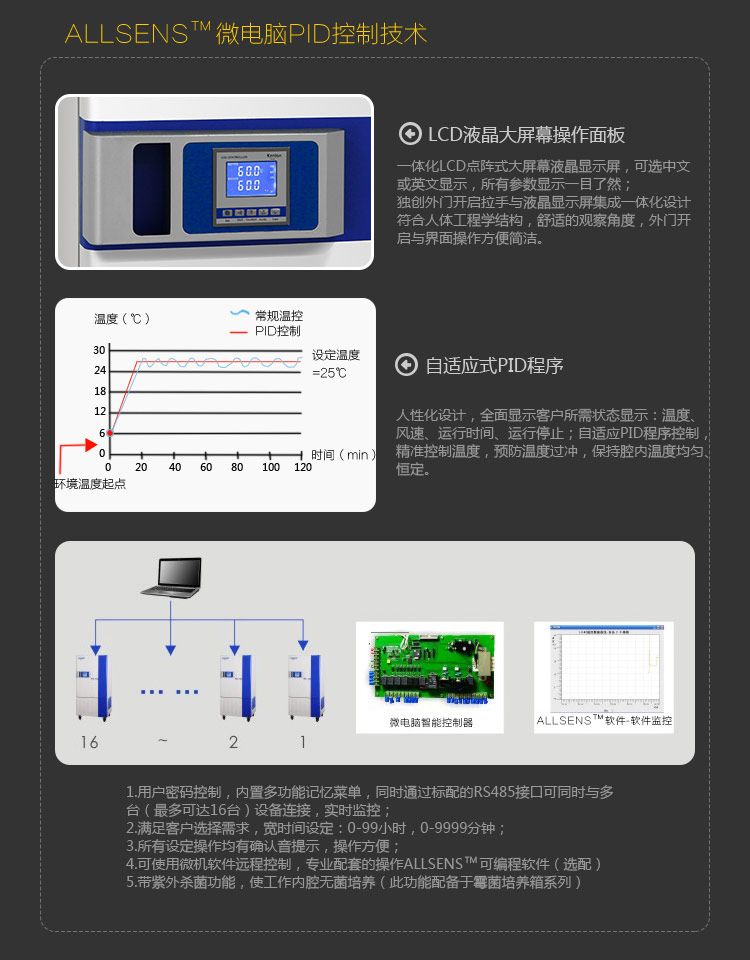 自适应式PID程度控制,精确控制温度,预防温度过冲,保持腔内温度均匀、恒定。