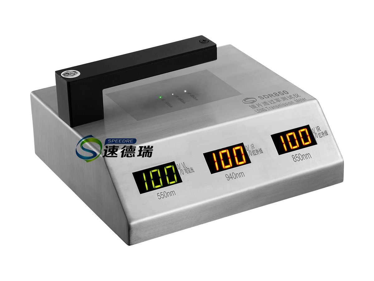 SDR850手机面板IR测试仪的测试原理是采用红外850nm 光源,红外940nm 光源和可见550nm 光源照射被测透明物质,感应器分别探测三种光源的入射光强和透过被测透明物质后的光强,透过光强与入射光强的比值即为透过率,用百分数表示