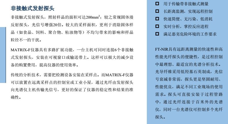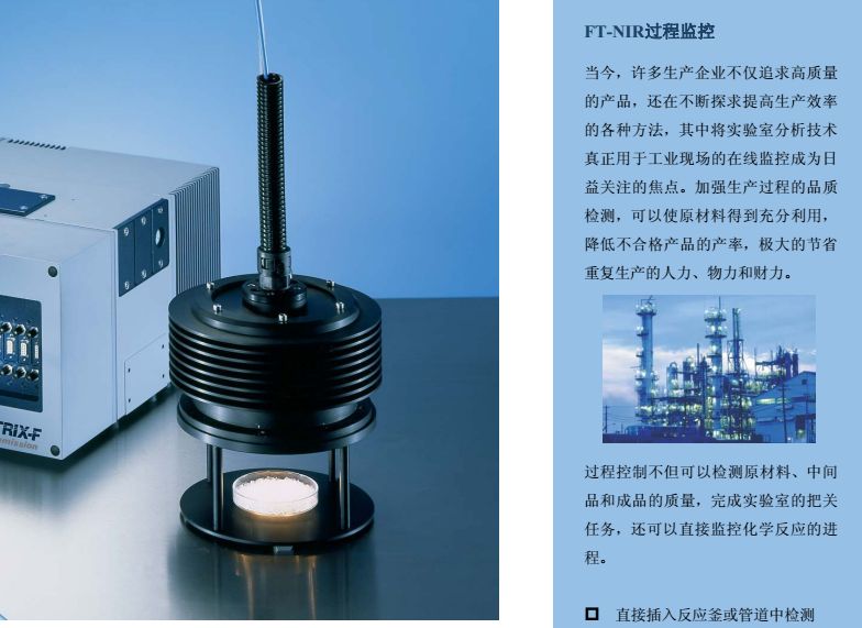 MATRIX-F型傅立叶变换近红外光谱仪是布鲁克公司推出的新一代工业在线过程分析仪, 也是第×台可直接应用于恶劣环境下的工业级近红外光谱仪,并在2000 年获得“R&D 100”金奖。仪器设计紧凑、坚固耐用,可同时连接多条光纤探头,直接用于反应釜或管道的过程监控。创新性的一体化设计保证了测试结果的连续性、准确性,大大减少了仪器故障的发生频率,真正意义上实现了仪器之间模型的传递与共享。同时,仪器还支持各种工业标准通讯协议,可与DCS等控制系统实现信息实时传输。因此,MATRIX-F能够最大程度的满足工业在线分析的各种要求,使过程控制达到更高境界。 从进厂原料的鉴定到中间产物、制成品的在线监测,MATRIX-F型傅立叶变换近红外光谱仪能够为过程控制提供完善的解决方案。采用内置多路器可使一台仪器同时监控6个反应过程。各种形式的光纤探头应用于过程分析,极大方便了对粉末、颗粒、粘稠液体等不同形态样品的检测。 MATRIX-F凭借独特的系统设计,既可用于实验室分析,进行方法开发;也可直接移至工业现场用于过程检测。此外,仪器外围附件还可以独立的安装在19英寸的标准工业机柜中, 并配有滑轨便于维护操作。 MATRIX-F操作方便、维护简单。所有易耗部件都是安置在预准直模块上的独立光学部件, 能够实现快速更换而无需重新调整仪器。此外,光学系统、检测系统和电子系统被安装在各自独立的密封室中,所以维修或更换某一系统时不会影响其他系统的密封与干燥。在线诊断系统实时监控各个部件的运行情况,帮助用户及时了解仪器的当前状态。仪器还配有内置标准验证单元,通过运行OVP软件确保测试系统处于正常运行状态。MATRIX-F 近红外在线光谱仪
