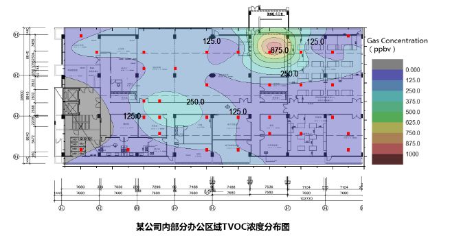 利用DT-100对某公司内部办公区域VOCs进行检测,可得到各物质区域空间浓度分布图。其中TVOC、甲苯、二甲苯的浓度分布图如下: